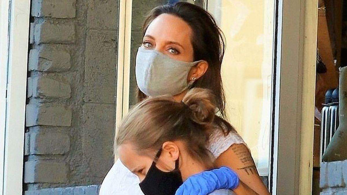 Конечно, Джоли после длительного пребывания на карантине не забывает о средствах защиты от коронавируса, пандемия которого до сих пор продолжается в мире. Она надела на лицо стильную защитную маску серого цвета, а на руки голубые резиновые перчатки. Волосы актриса уложила ровно, а на лице сделала легкий макияж, нарисовав ресницы тушью. Ее уши украшали минималистичные серьги.