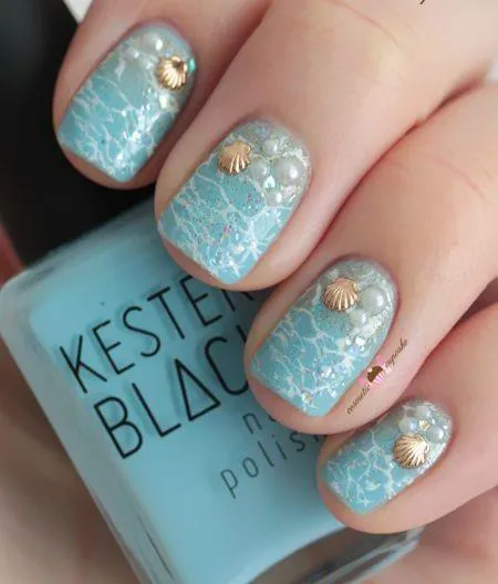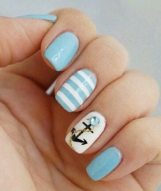 В этом году особенно популярна легкая и светлая полоска в платьях, брюках и купальниках. А голубые, белые и пастельные цвета можно увидеть все больше в круизных коллекциях известных брендов. Поэтому вы точно не прогадаете, если будете выбирать именно этот оттенок в дизайне ваших ногтей.