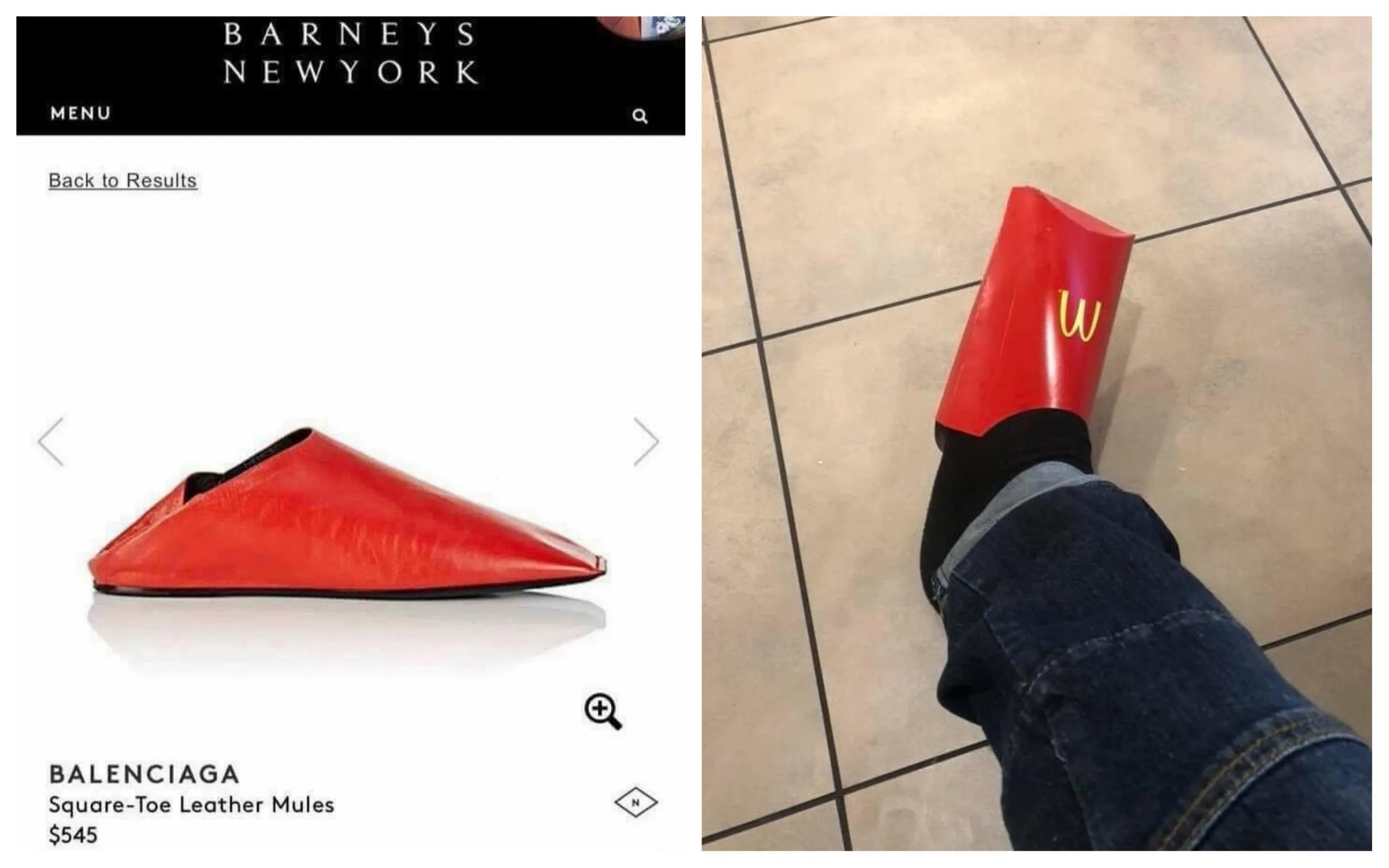 Обувь от Balenciaga слева и пародия McDonald's / Коллаж LifeStyle 24 / Twitter / @BruuhConsta