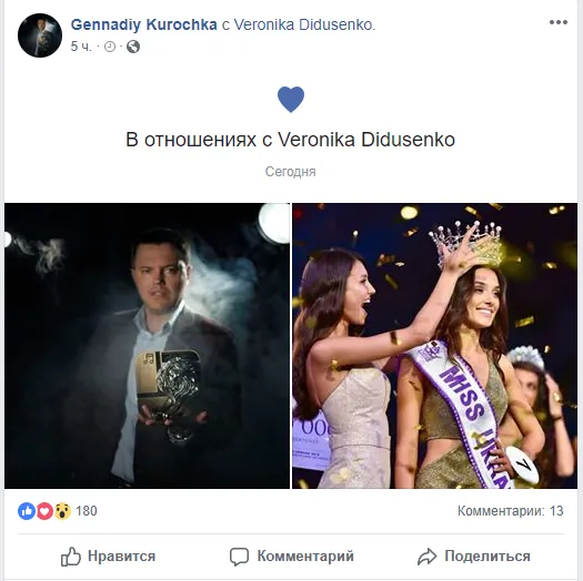 В СМИ появилась новая информация о дисквалифицированной красавице. Как оказалось, Вероника Дидусенко имеет отношения с основателем и управляющим партнером компании CFC Consulting Геннадием Курочкой. Об этом пара написала на своих страницах в Facebook.