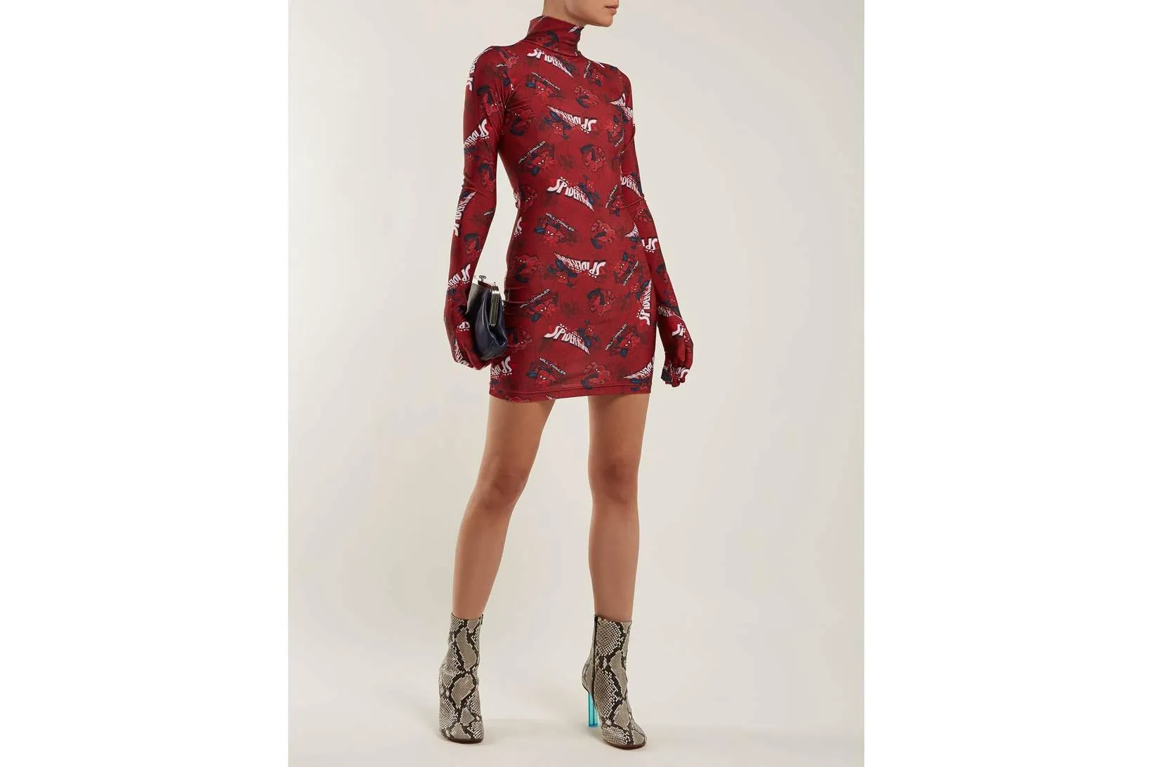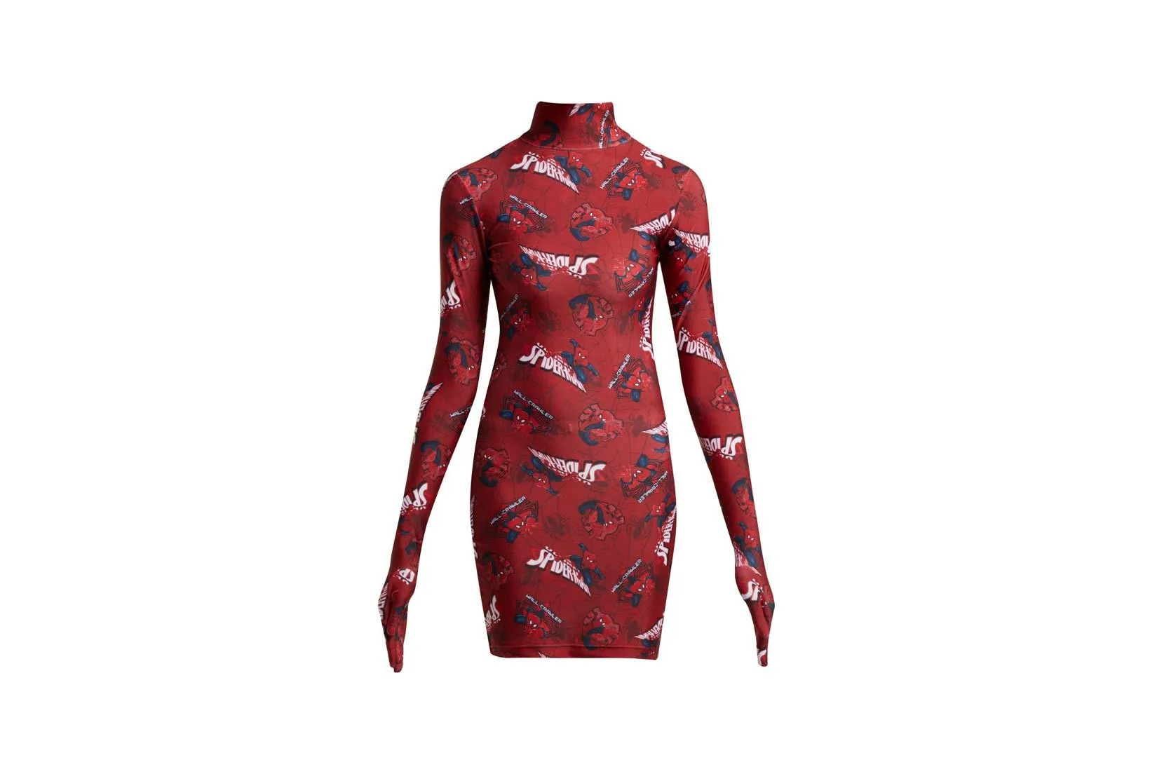 Вечернее мини-платье, вдохновленное костюмом вымышленного супергероя Майлза Моралеса (Человека-паука), стоит 980 долларов. Обтягивающее платье также содержит крошечные бело-синие принты Спейдермена и фирменные надписи. Главной особенностью платья являются рукава, которые переходят в перчатки и воротник-стойку.