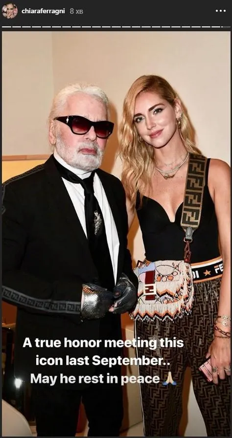 Одна из самых богатых инфлюенсеров мира Кьяра Ферраньи тоже поделилась сообщением в Instagram-Stories. Итальянская блогерша опубликовала совместное фото с модельером и отметила, что для нее было честью сотрудничать с Лагерфельдом: "Это было настоящей честью сотрудничать с иконой стиля в сентябре прошлого года. Пусть он покоится в мире".