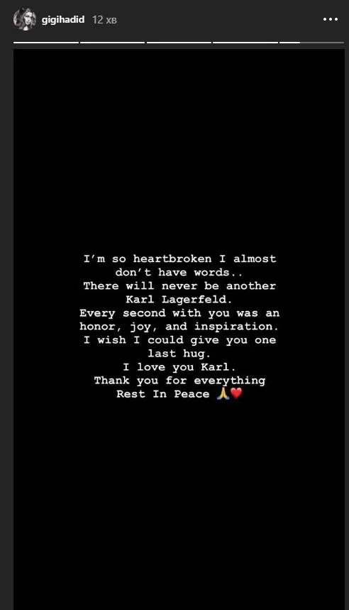 "Мое сердце разбито. У меня просто нет слов... Больше никогда не будет такого человека, как Карл Лагерфельд. Каждая секунда с вами была полна честью, радостью и вдохновением. Я мечтаю, чтобы обнять вас в последний раз. Я люблю вас, Карл. Спасибо за все. Покойтесь с миром", – не сдержала горьких эмоций модель Джиджи.