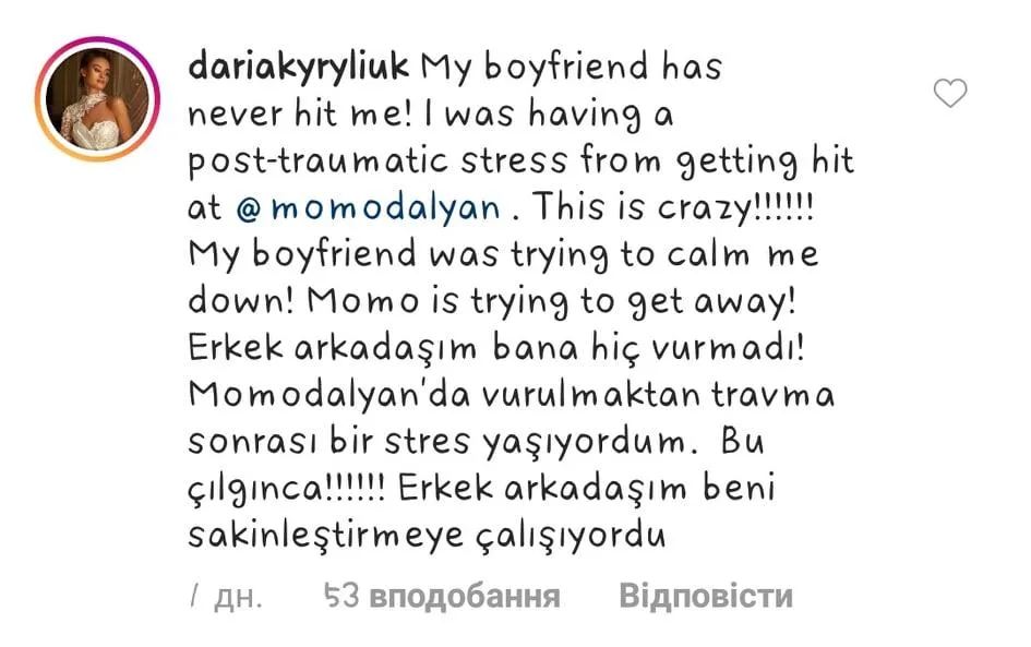 Проблема не имеет ничего общего с пляжем Момо, как сообщила Дарья Кирилюк. Сцена насилия состоялась только между ними,