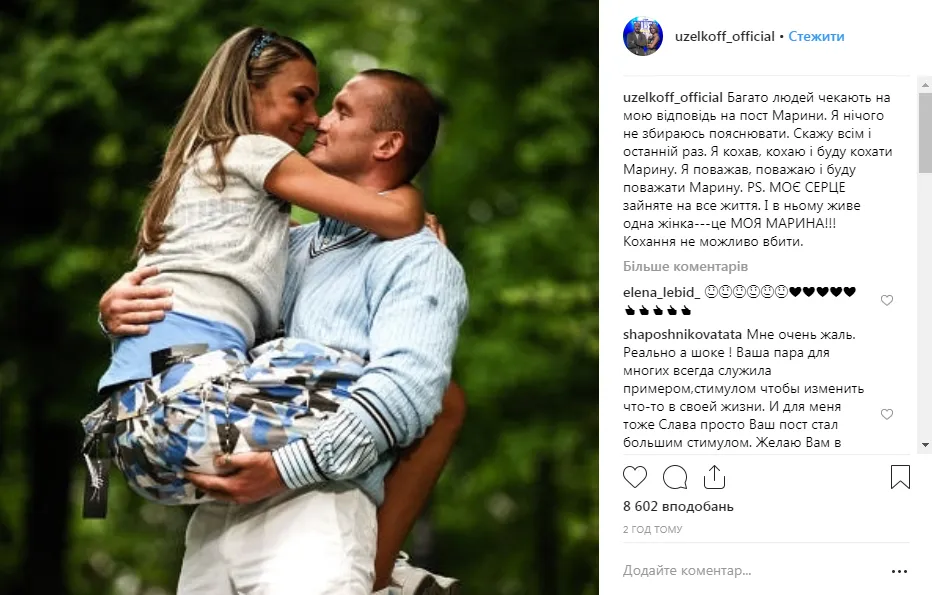 Многие люди ждут моего ответа на пост Марины. Я ничего не собираюсь объяснять. Скажу всем и последний раз. Я любил, люблю и буду любить Марину. Я уважал, уважаю и буду уважать Марину. P.S. Мое сердце занято на всю жизнь. И в нем живет одна женщина – это моя Марина!!! Любовь невозможно убить,