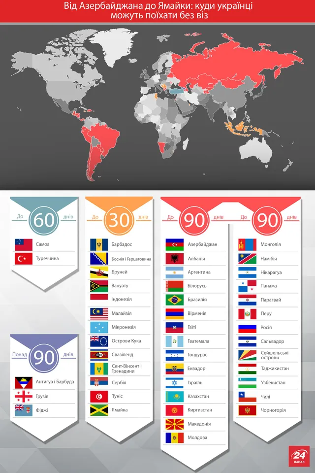 Журналисты сайта "24" собрали в одной инфографике данные о сроках пребывания в странах, которые украинцы могут посетить без виз, ведь в некоторых из них без оформления дополнительных разрешений можно находиться до 30 дней, а в нескольких — даже более 90 суток.