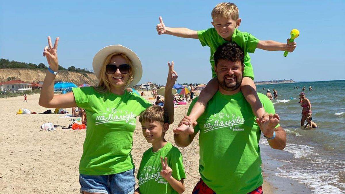 На днях в профиле исполнительницы появилась серия кадров, на которых она изображена вместе с мужем, продюсером Виталием Човныком и сыновьями – Олегом и Юрчиком. Они одеты в фирменные футболки Ирины. На зеленом наряде белым цветом написано название ее песни "Хочу на Мальдивы". Снимки были сделаны на одном из одесских пляжей, где Федишин отдыхает уже несколько дней. Видно, что семья в восторге от такого отпуска.