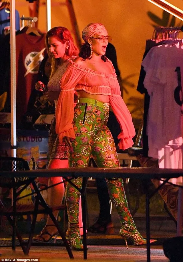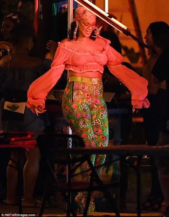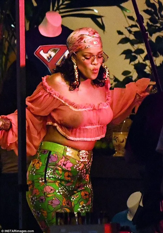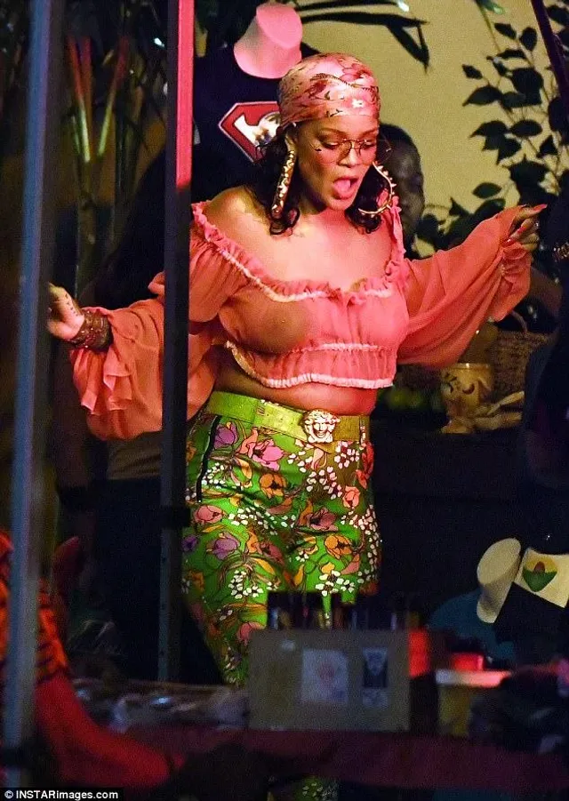 Рианна Одела прозрачный короткий топ без бюстгальтера и зеленые цветастые штаны в обтяжку.