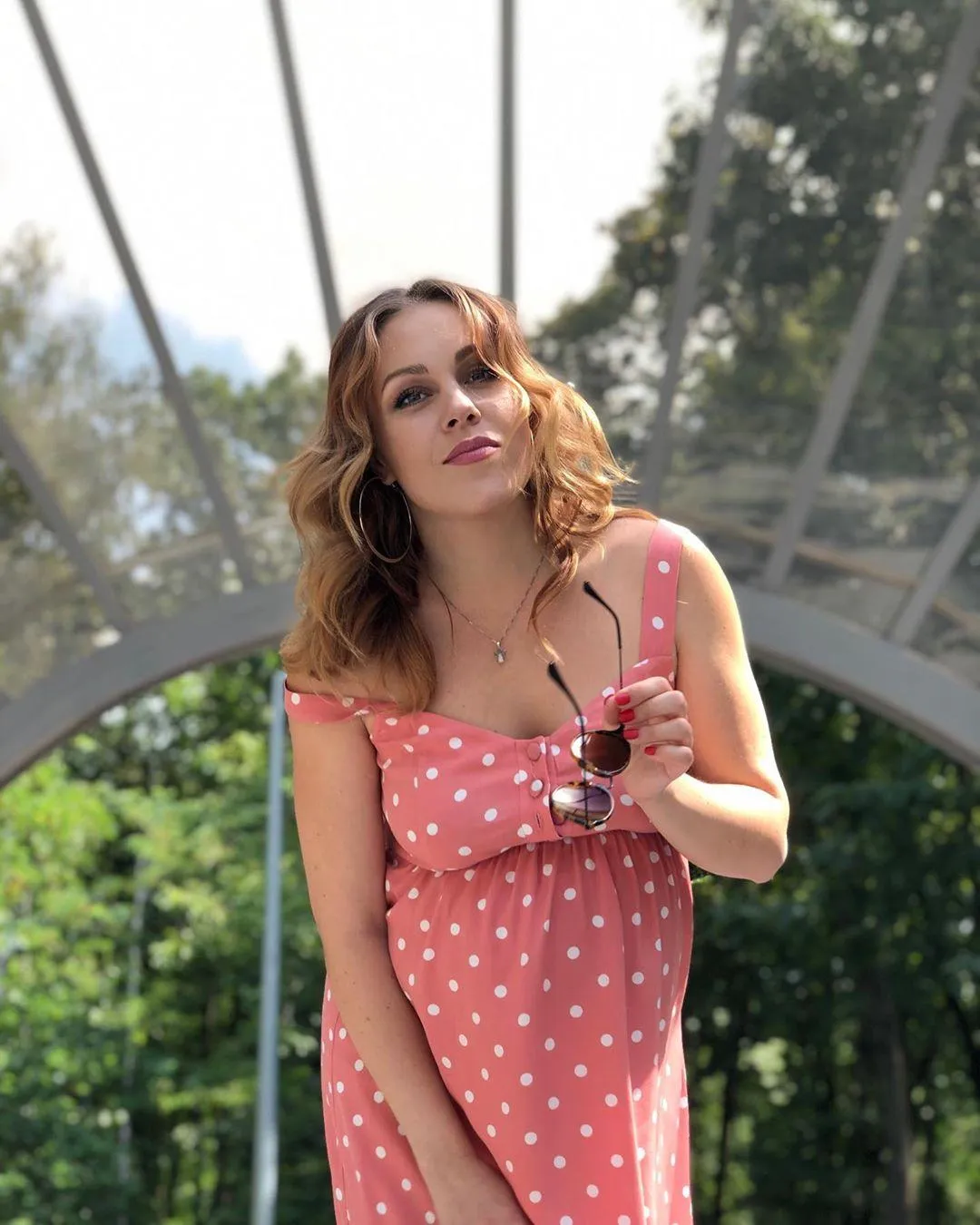 Для прогулки на свежем воздухе звезда выбрала нежно-розовое платье в крупный белый горох на пуговицах и с резинкой, которая выгодно очерчивала большой живот на последних сроках. Наряд на бретелях не облегал фигуру, что позволяло ей комфортно двигаться и чувствовать себя свободно. Для фотосессии она сделала волнистую укладку и насыщенный макияж с акцентом на глаза и розовой помадой.