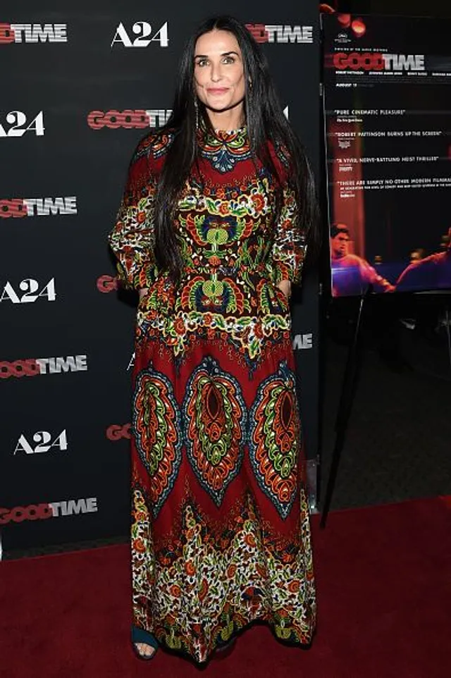 Деми Мур выбрала длинное красное платье с цветными принтами в театр Нью-Йорке: