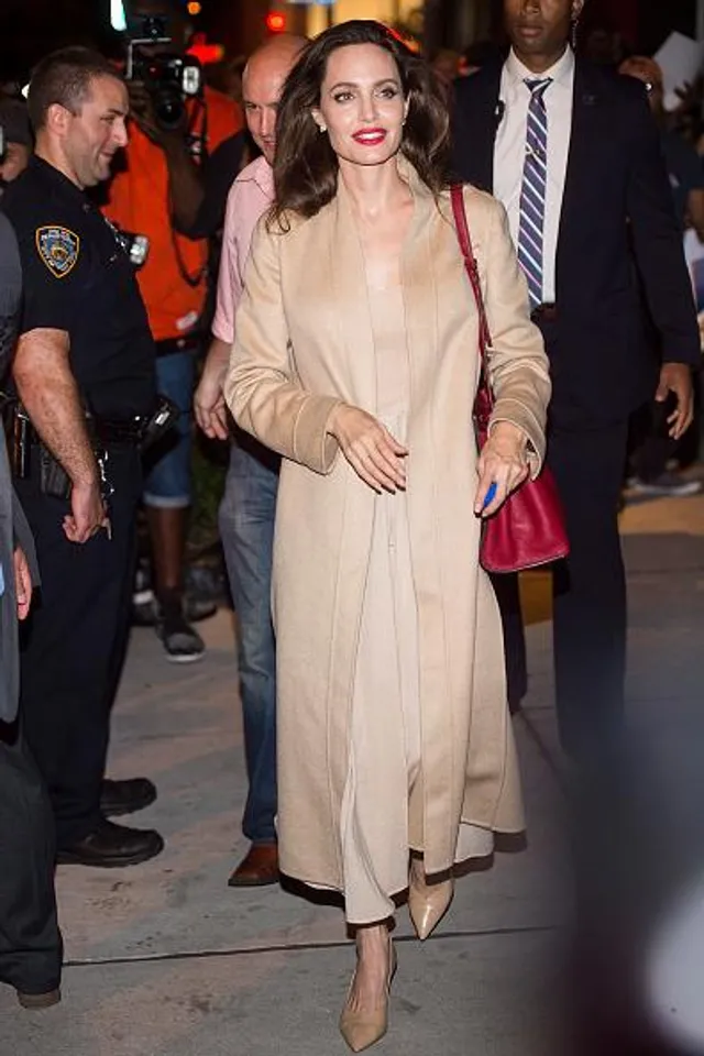 Анджелина Джоли в бежевом образе, однако выбрала красную сумку и подчеркнула губы красной помадой в Нью-Йорке: