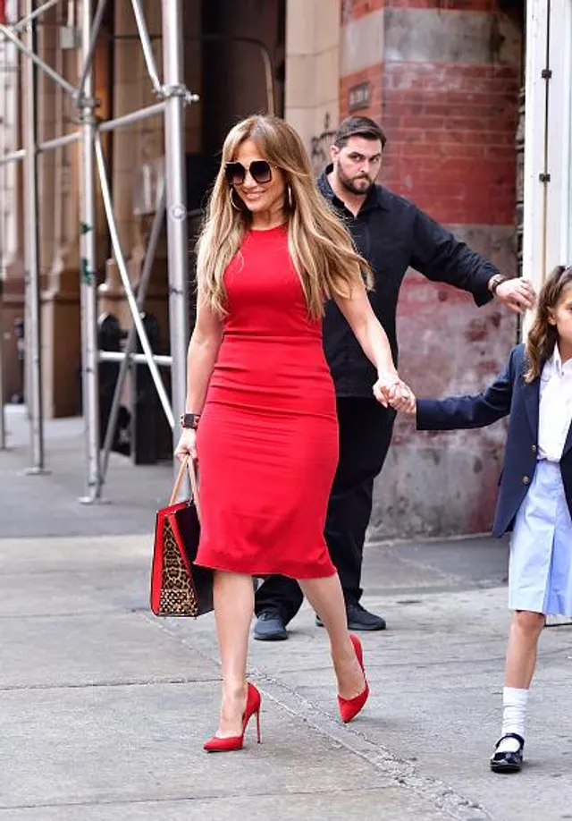 Дженнифер Лопес в красном платье и на красных каблуках спешит на телевизионное шоу канала АВС, Нью-Йорк: