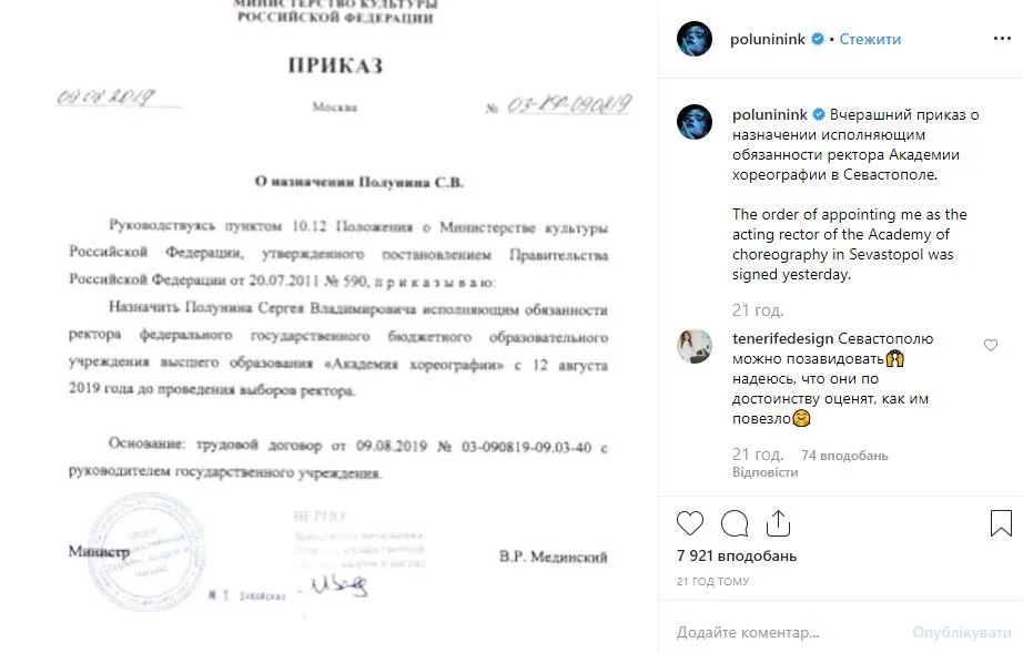 Новым "достижением" скандальный танцовщик поделился на своей странице в Instagram, прикрепив фото "указа". Да, Полунин стал исполняющим обязанности "ректора" Академии хореографии в Севастополе, которая подотчетна российской власти.