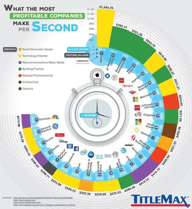 Если принимать во внимание только IT-сферу, то ближайшим конкурентом "яблочной" компании является Alphabet – "мать Google" – которая зарабатывает каждую секунду 615 долларов. Следом за ней идет Microsoft с доходом в 531 доллар в секунду.