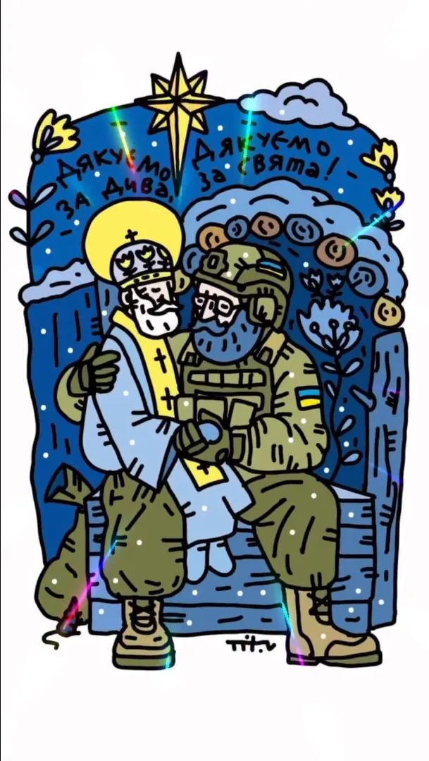 Исполнительница, как обычно, была очень немногословной. Она опубликовала только праздничную открытку-иллюстрацию украинского художника Никиты Титова. На ней святой Николай сидит на коленях у военного.