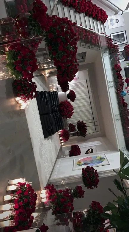 Так, огромное количество букетов красных роз и свечи украсили комнаты и лестницы помещения, где проживает звезда реалити-шоу.