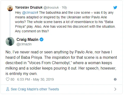 На днях на большой экран вышла 4 серия сериала "Чернобыль". Сразу после премьеры внимательные зрители заметили удивительные совпадения в сценарии с сюжетом пьесы украинско-немецкого драматурга Павла Арье. Журналист издания The Village на своей странице в Twitter обратился к создателям сериала с конкретными вопросами относительно плагиата.
