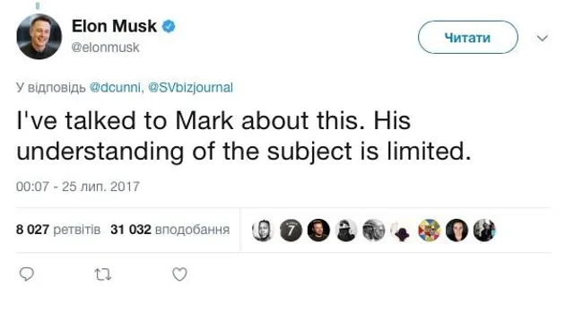 "Говорил на эту тему (искусственного интеллекта — 24) с Марком. Он имеет ограниченное понимание предмета разговора", — написал Илон Маск.
