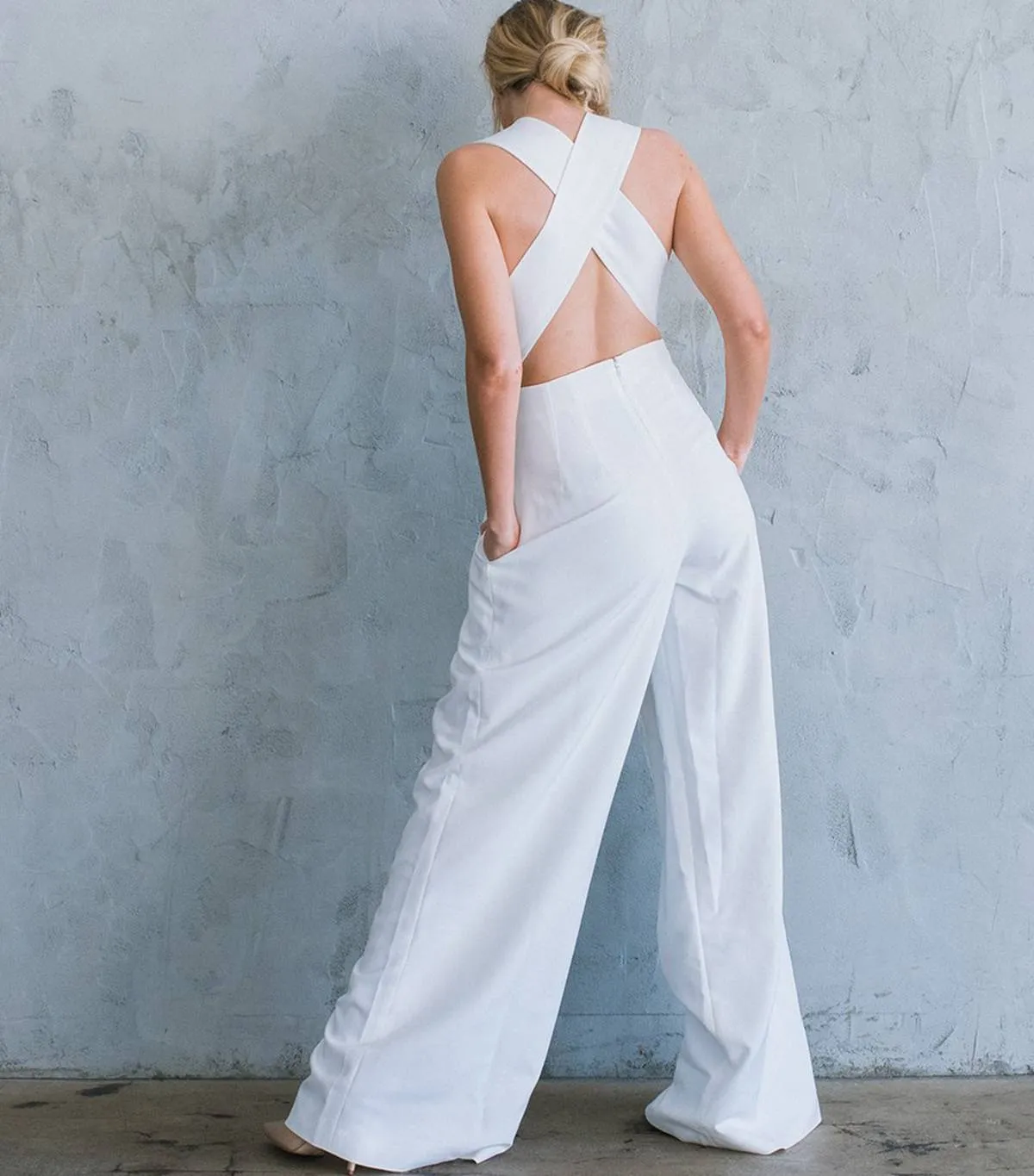 Комбинезон выглядит не только весело, но и практично. Вы можете на официальную церемонию надеть платье, а потом переодеться в роскошный свадебный комбинезон, чтобы ничего не мешало на танцевальной площадке.