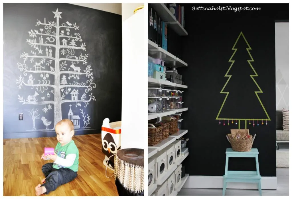И внимание – способ для очень ленивых. Одну стену превращаете в школьную доску черного цвета, на которой елку рисуете мелом. И просто, и стильно. А еще – прекрасное развлечение для детей.