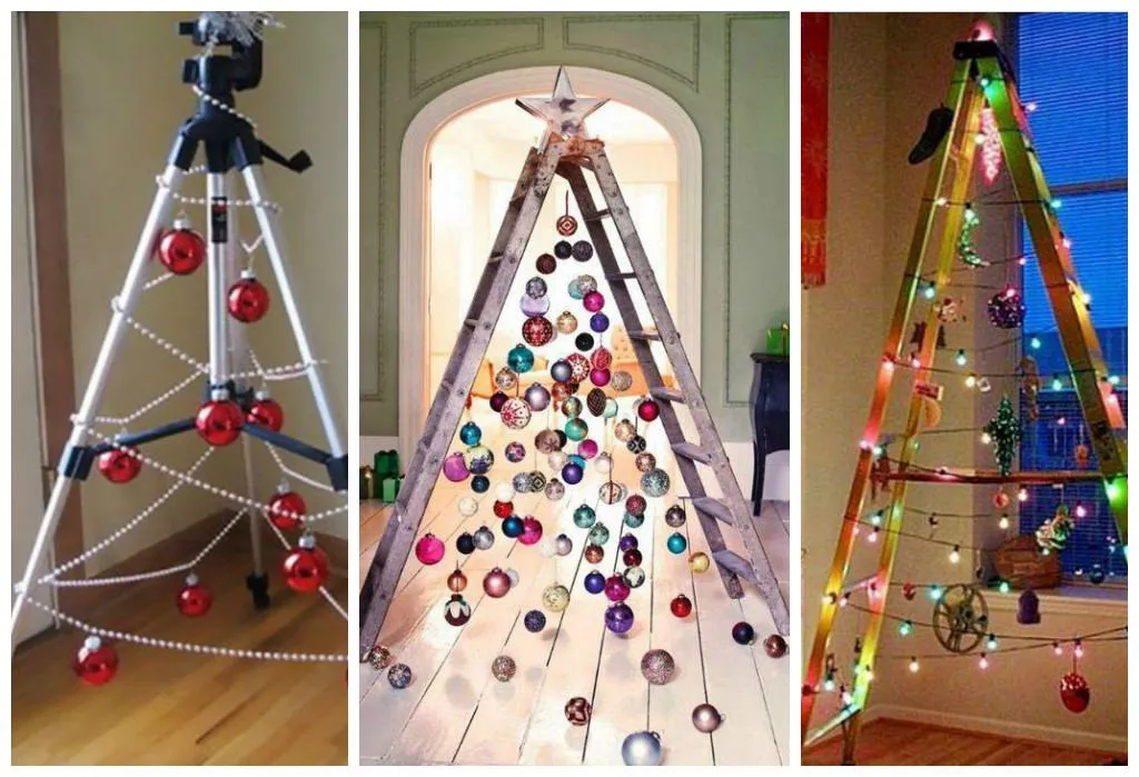 Праздничное деревце из лестницы или штатива понравится фотографам. И здесь все очень просто – крепко зафиксировали ножки штатива или лестницы и начинаем украшать.