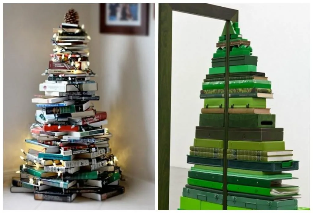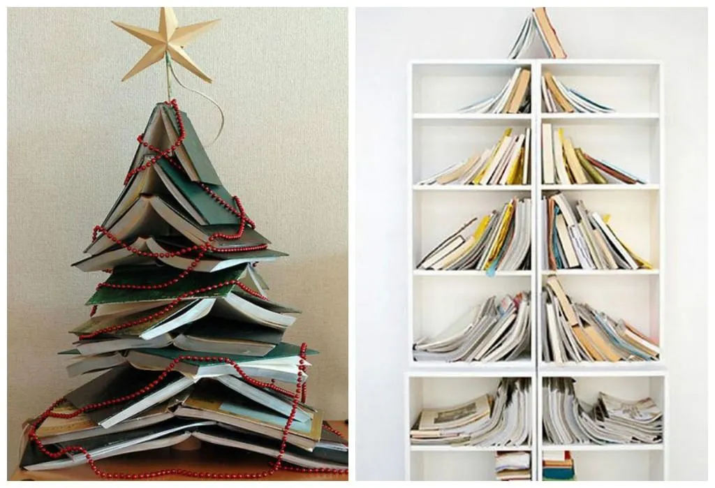Также популярна книжная елка. Выложить ее можно как башней, постепенно выкладывая раскрытые или закрытые книги в нужной форме.