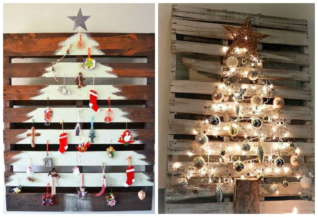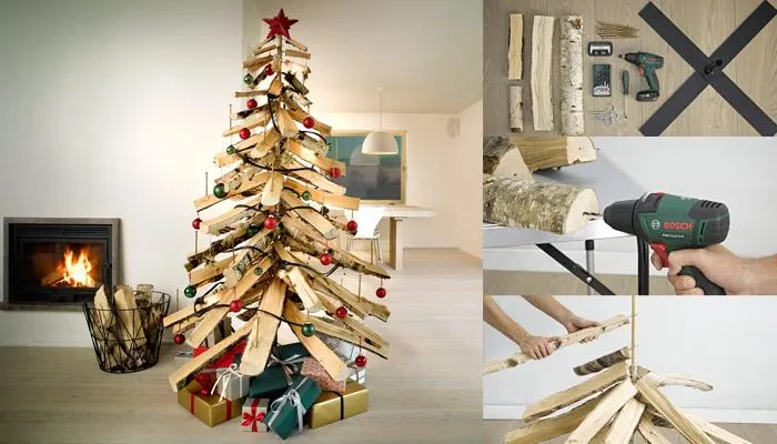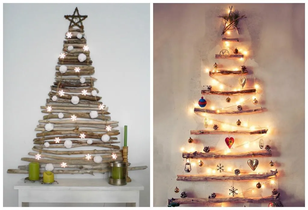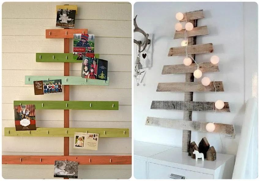 Также популярны деревца из веток или конструкции из дощечек, которые между собой вяжем с помощью ниток, ленты или проволоки. Такая елка очень практична, ведь не занимает лишнее пространство дома.