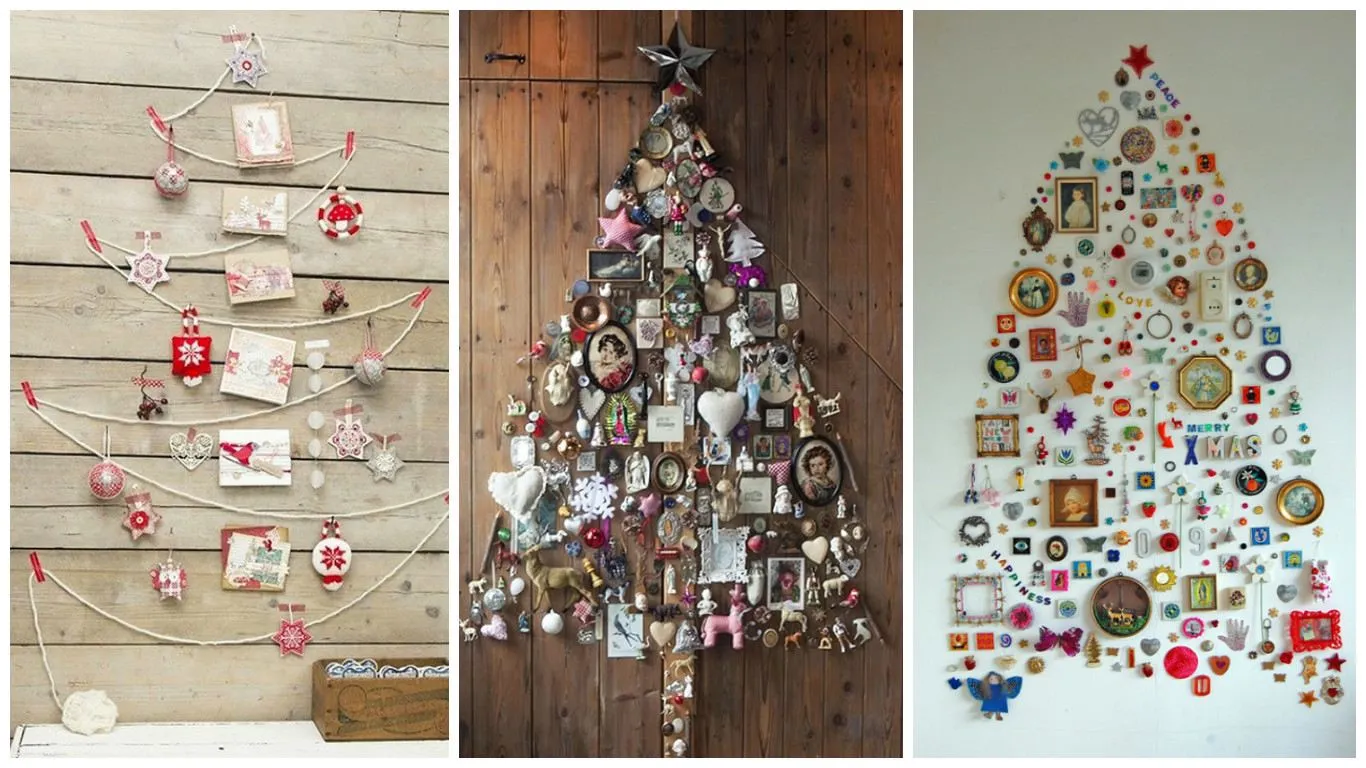 Форму деревца можно выложить на стене из различных предметов в формате 2D. Это могут быть круглые срезы поленьев, различные безделушки, фото с рамками, посуда, гирлянды с игрушками, да и вообще – что-либо, что крепится к стене.