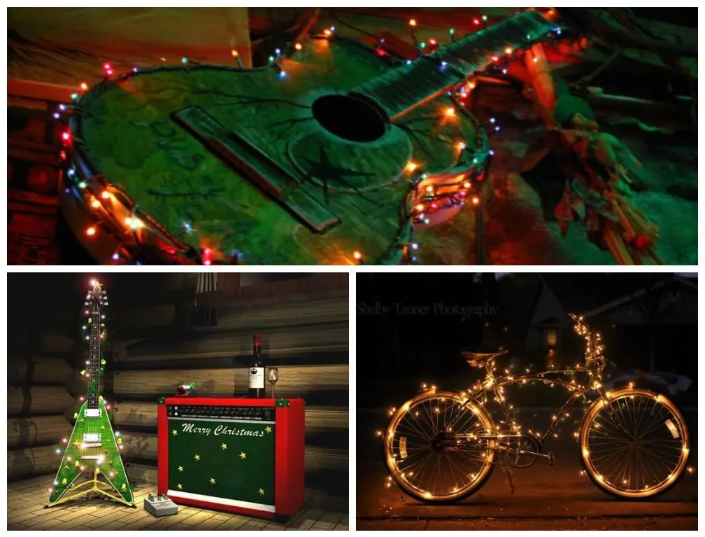 Елка из музыкального инструмента или велосипеда. Такое любят хипстеры и музыканты. Взяли предмет, который будет служить вам елкой, намотали на него гирлянды, и готово.
