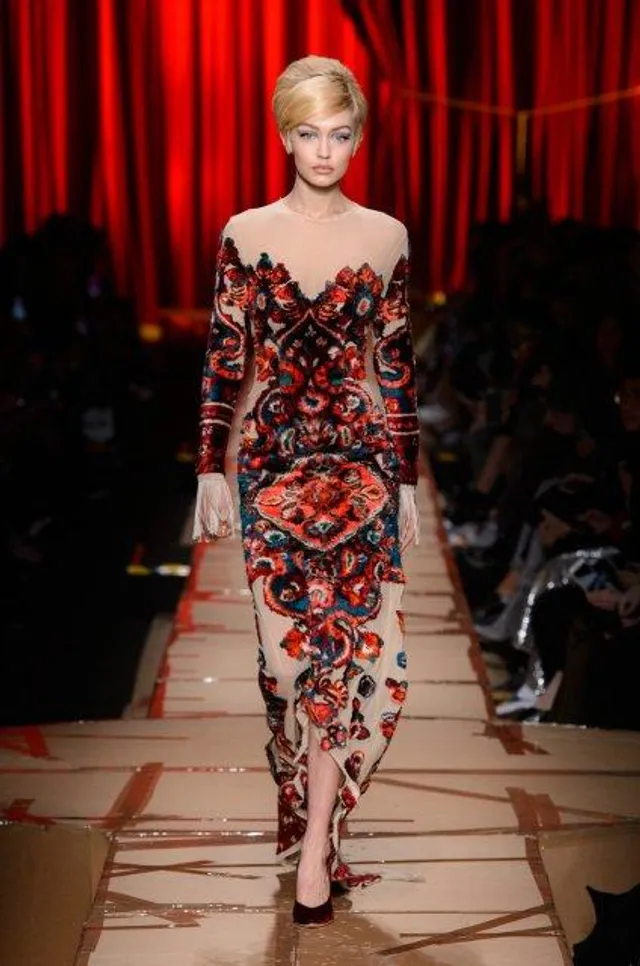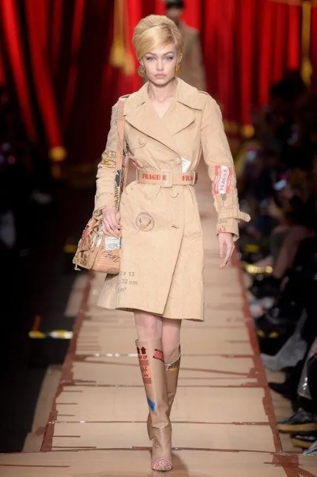 На подиум Moschino Джиджи вышла несколько раз. В частности, модель продемострировали бежевый тренч и длинное платье с ярким узором.