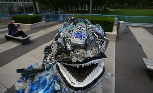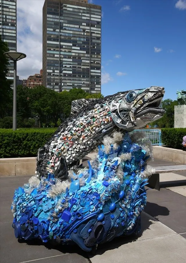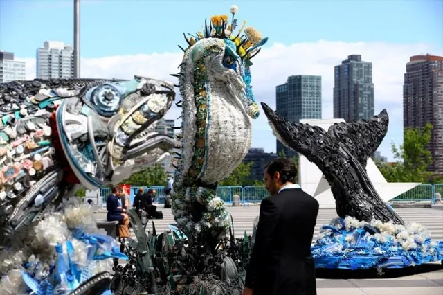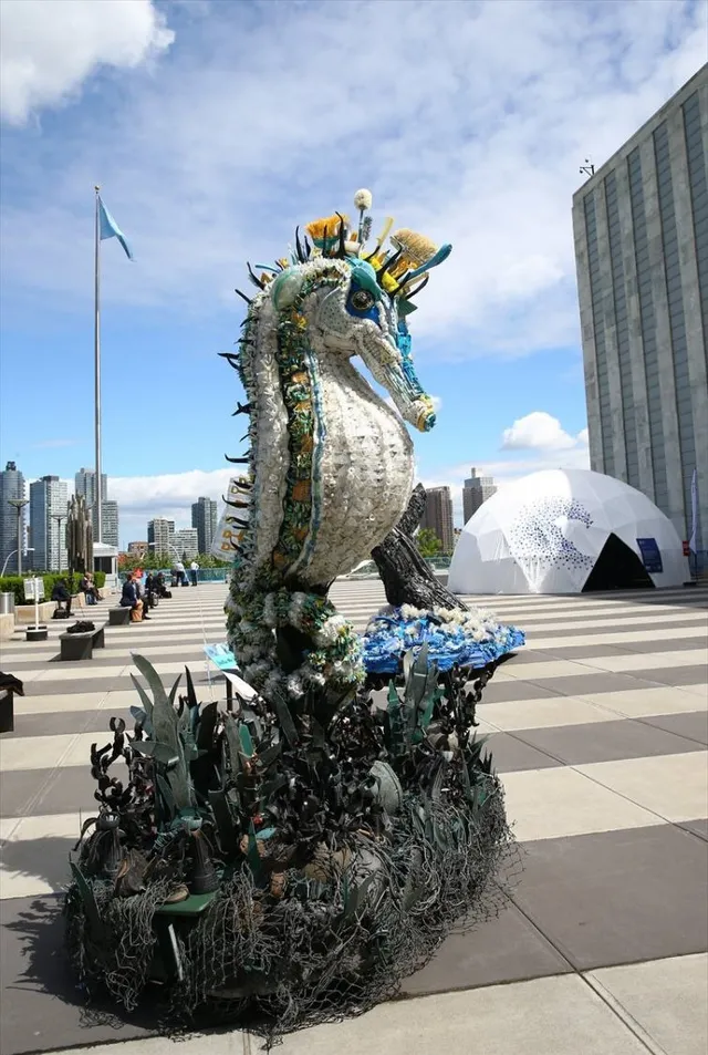 В то время, как продолжалась конференция с 5 по 9 июня, у стен организации можно было разглядеть в больших скульптурах из пластикового мусора двухметровый хвост кита, морского конька и коралловые рифы.