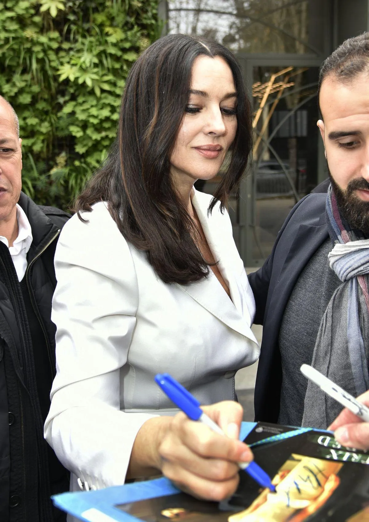 54-летняя актриса дополнила образ бежевыми туфлями на высоком каблуке и черной крупной сумкой. В Париже перед входом в студию поклонники окружили Беллуччи и получили желанные автографы кинодивы.