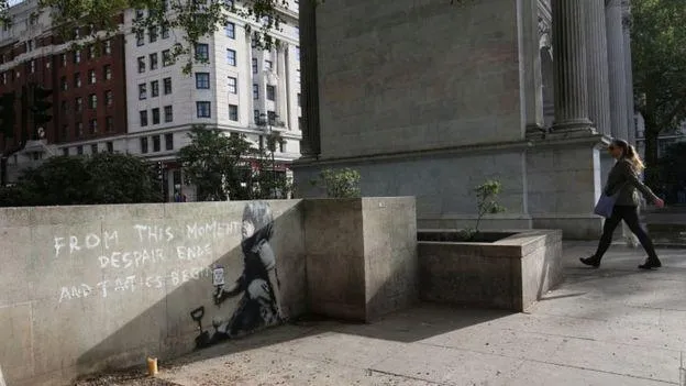 На ней изображена девочка, которая сидит возле ростка. В руках она держит табличку с эмблемой радикального экологического движения Extinction Rebellion ("Бунт против вымирания"). Надпись на граффити переводится как "С этого момента отчаяние заканчивается и начинается стратегия".