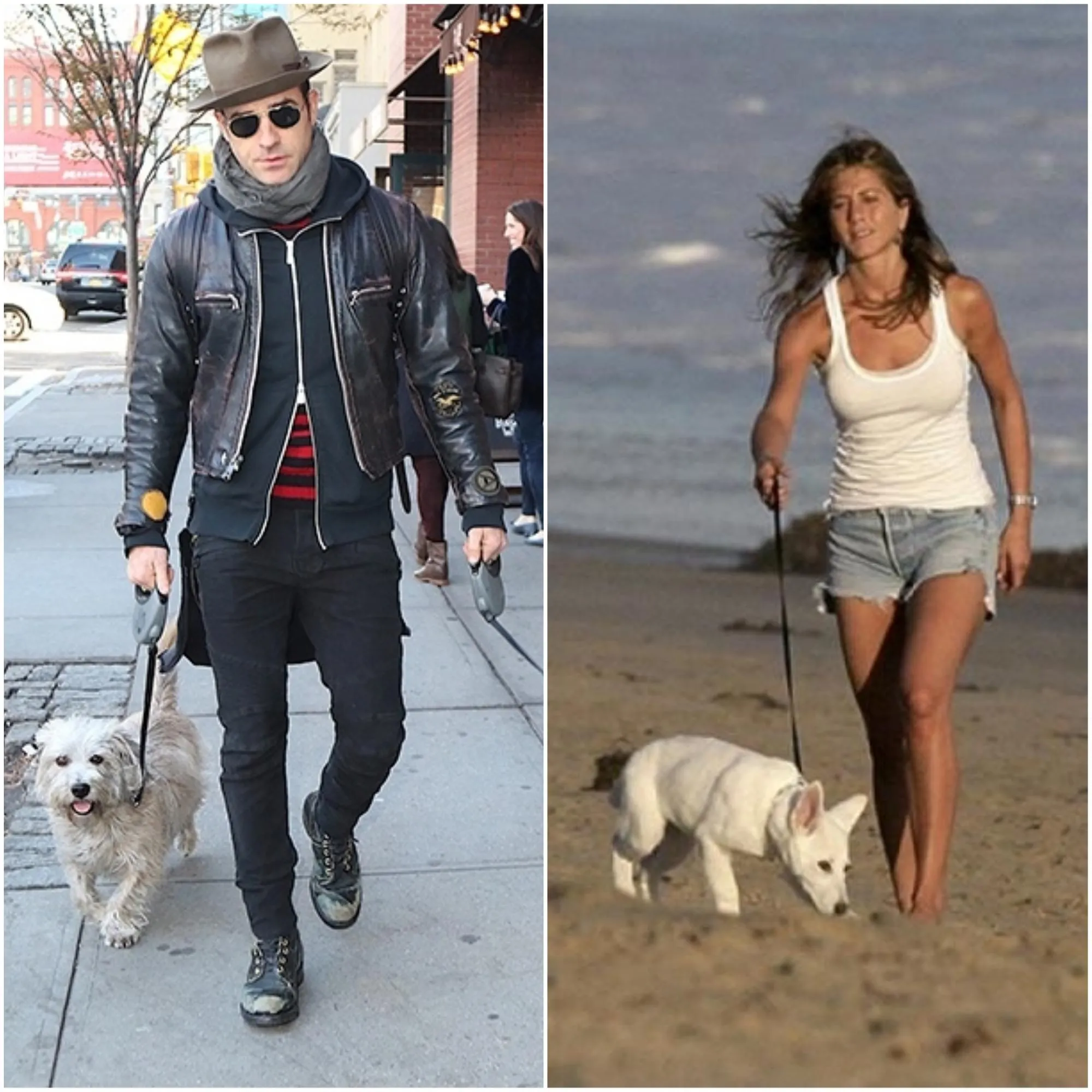 Джастин Теру и Дженнифер Энистон на прогулках с собаками