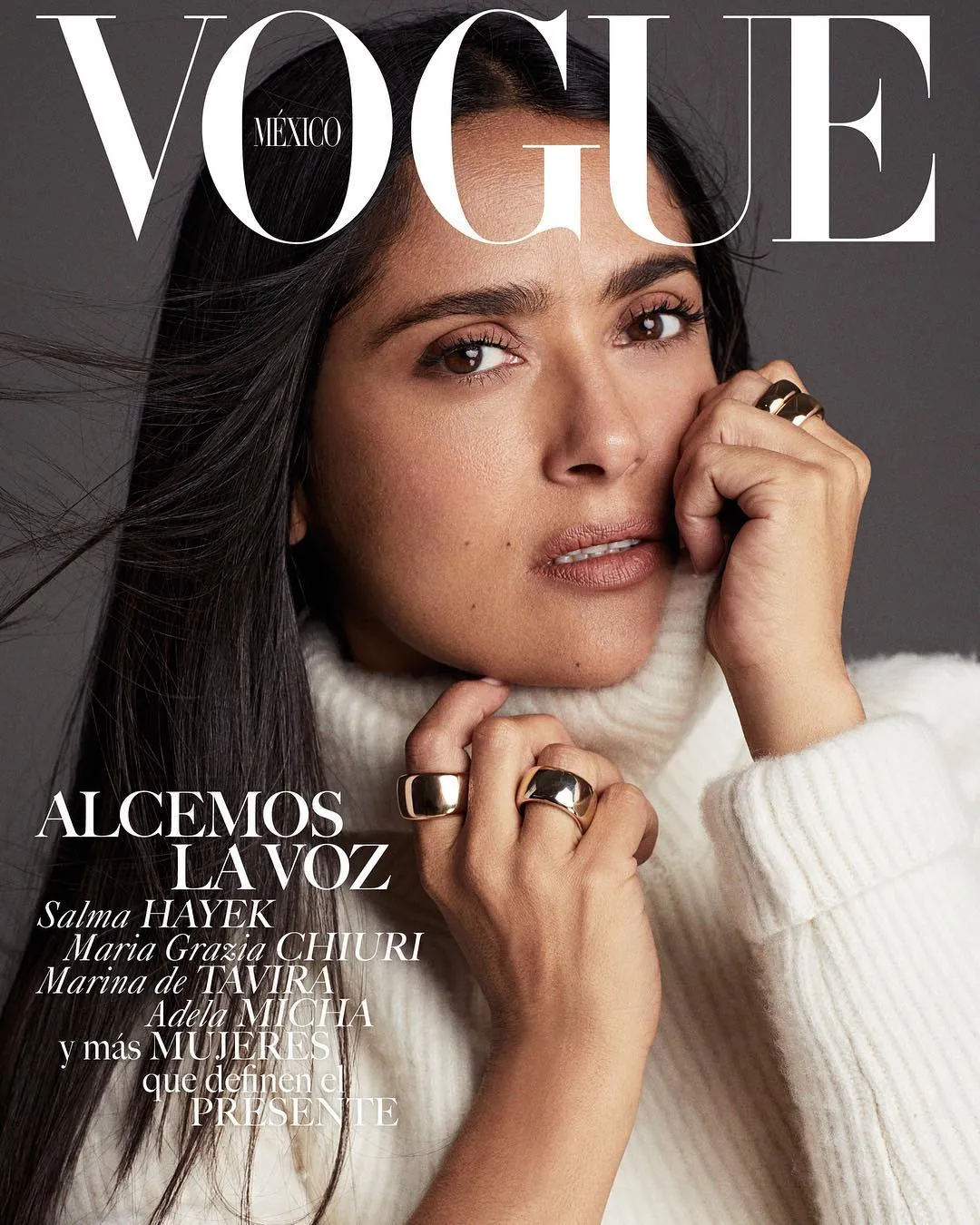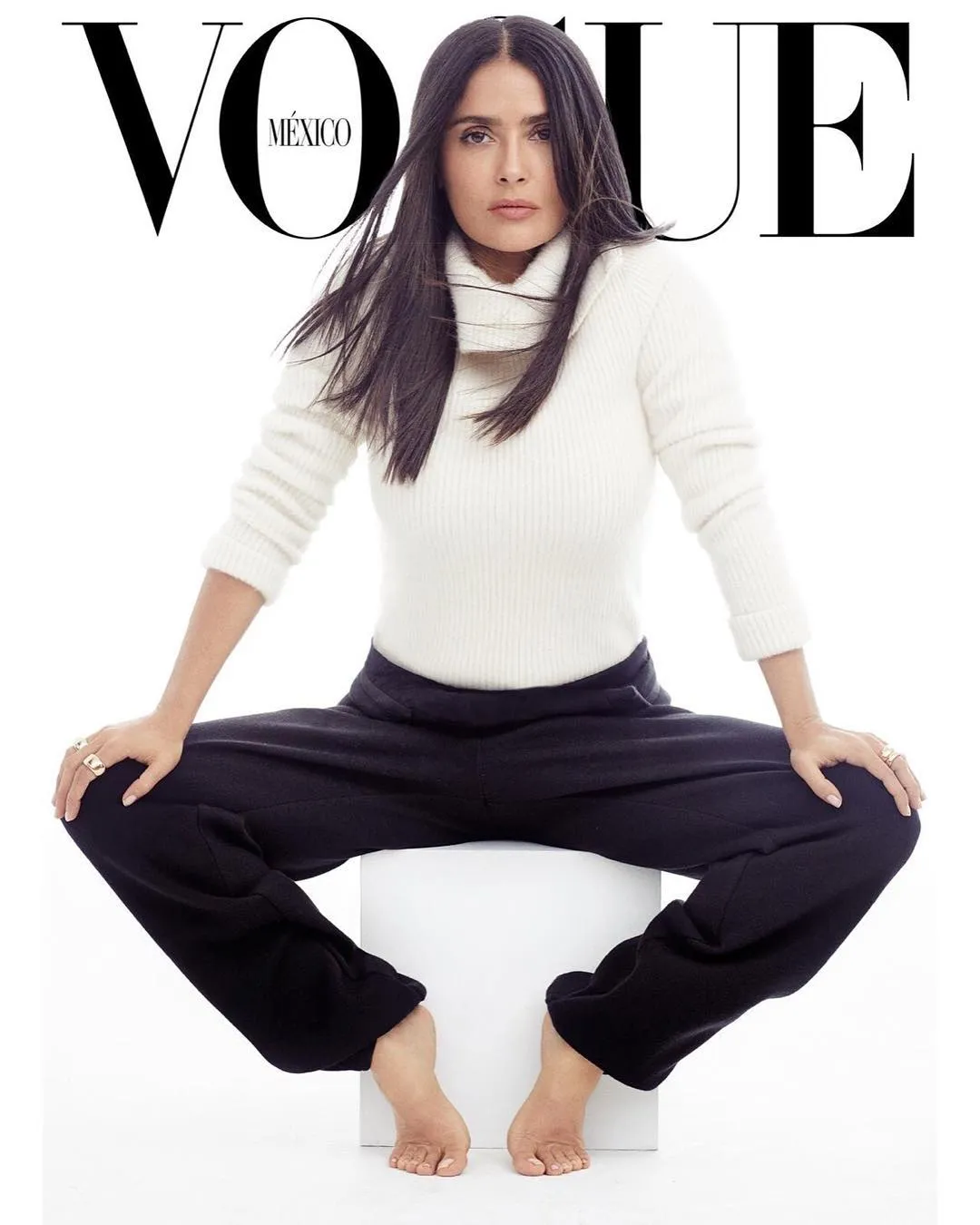 Для обложки звезда позирует в простом белом вязаном свитере и темно-серых свободных брюках. Визажисты сделали минимум макияжа актрисе с легким акцентом на глаза коричневыми тенями. Из аксессуаров на Салме только золотые кольца.