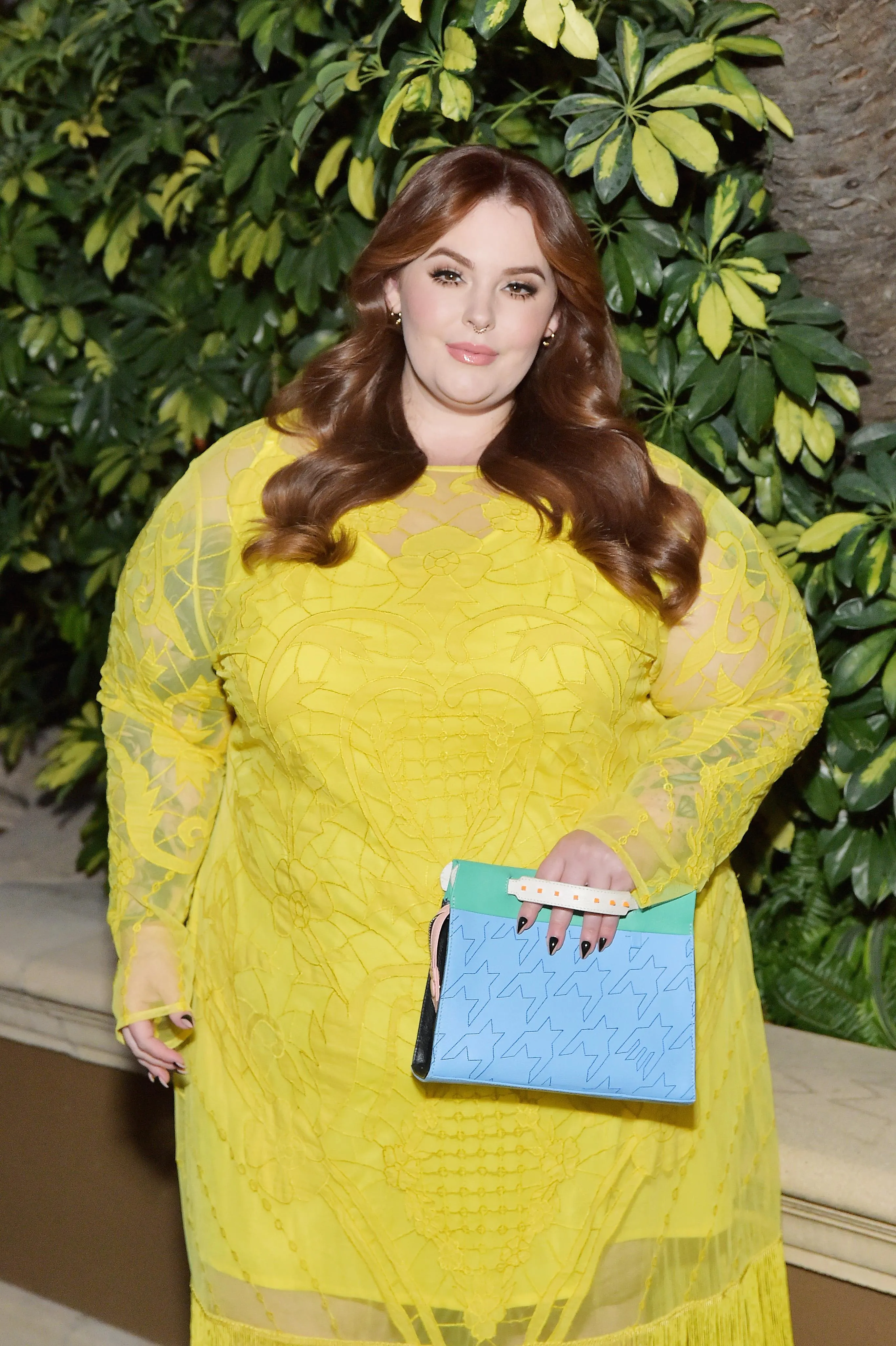 Перед камерами модель Тесс Холлидей появилась в ярком желтом платье, украшенном бахромой снизу.