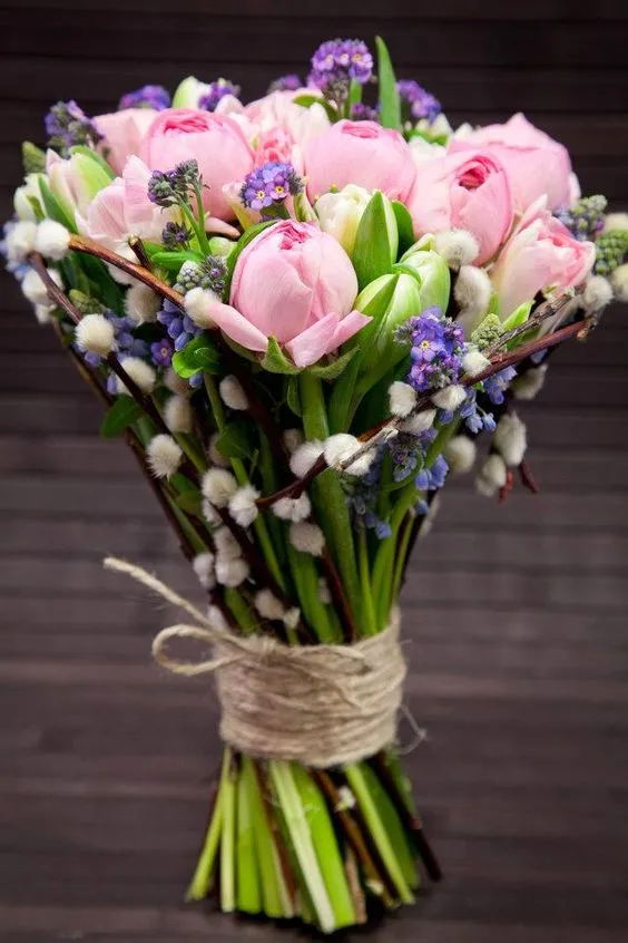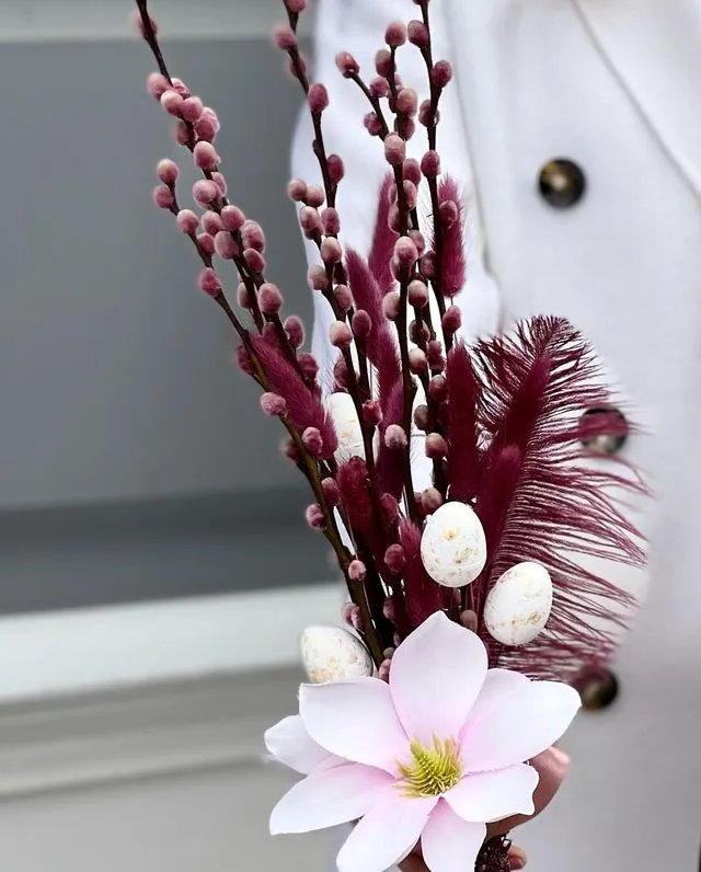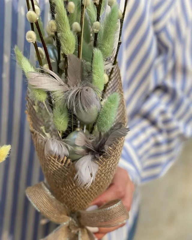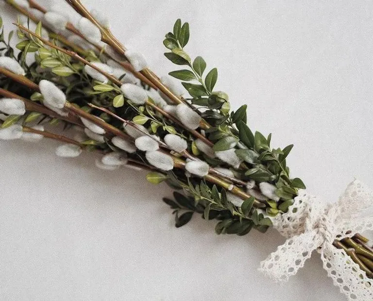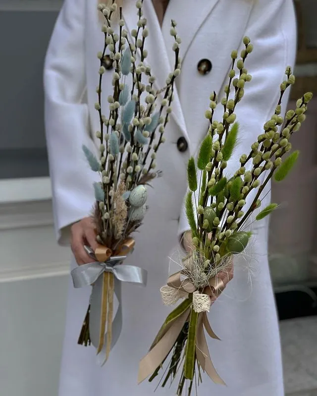 Еще давно вербные ветви украшали листьями мирта и сухоцветами. Эти традиционные элементы декора актуальны и красивы до сих пор. Создавая букет, ставьте каждые веточки по очереди. В конце крепко свяжите все нитью или лентами по желанию.