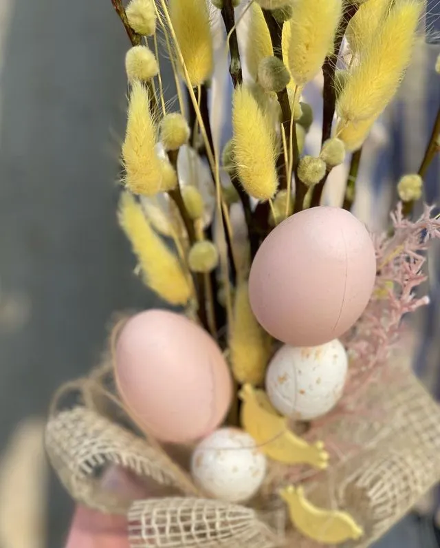 Другим вариантом украшения букетика станут декоративные маленькие яички или другие фигурки. Их можно прикрепить к веточкам и также обвязать лентой или мешковиной как полноценный букетик. Соблюдайте одну цветовую гамму, чтобы шутка выглядел красиво.