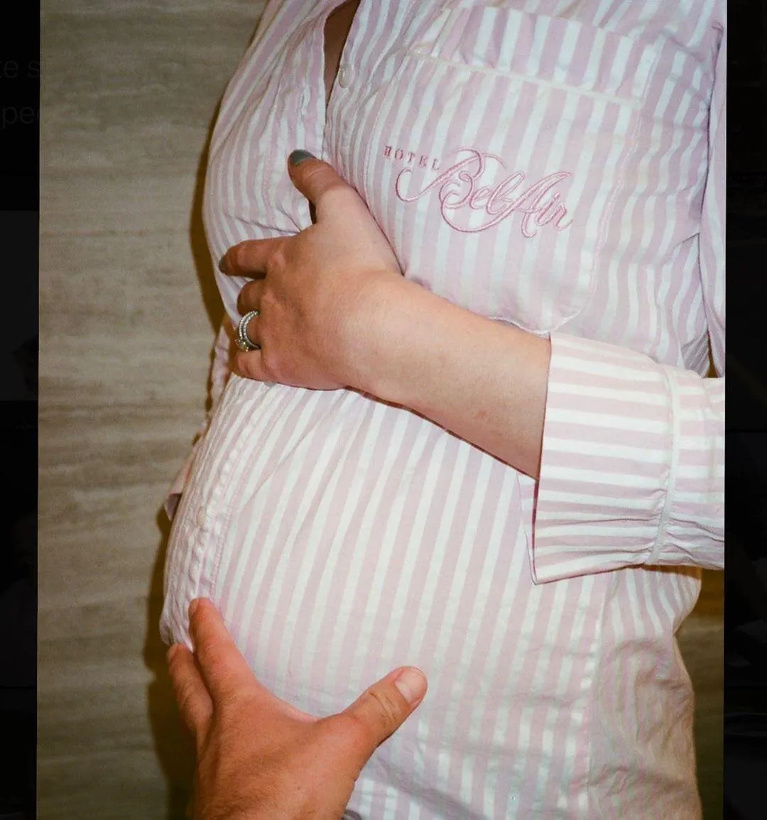 На третьем фото Софи Тернер позировала в нежном полосатом бело-розовом платье-рубашке. Демонстрировать свое лицо на камеру она не стала, зато любимый человек Джо Джонас сфотографировал только животик жены, чувственно протянув руку к нему.