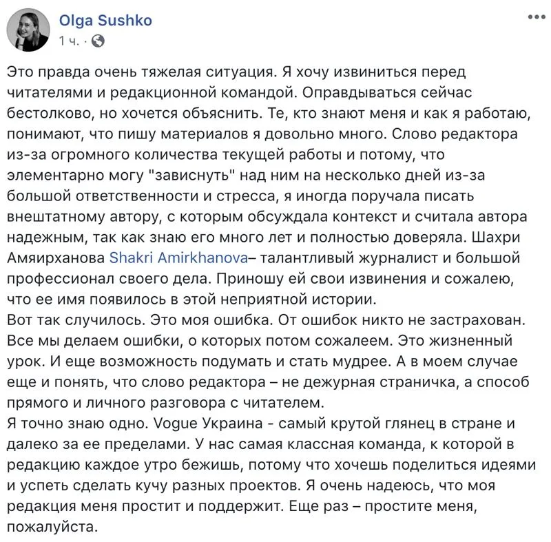 Сама головна редакторка вирішила не відкараскуватись від звинувачення та попросила вибачення у читачів і редакційної колегії. Ольга Сушко пояснила, що через чимале навантаження вона доручила головну статтю червневого номеру Vogue Україна позаштатному журналісту. Вона вибачилась перед Шахрі Амірхановою, запевнивши, що це була її помилка – не перевірити роботи фрілансера.