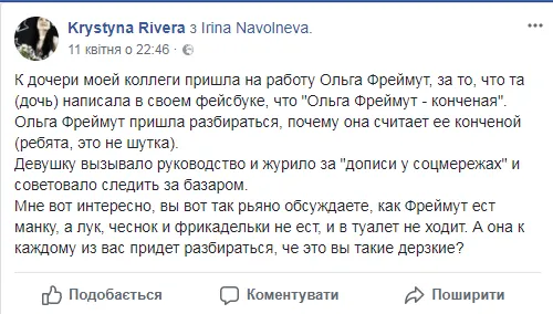 До доньки моєї колеги прийшла на роботу Ольга Фреймут, за те, що та написала в Facebook, що"Фреймут – кончена". Люди, це не жарт,