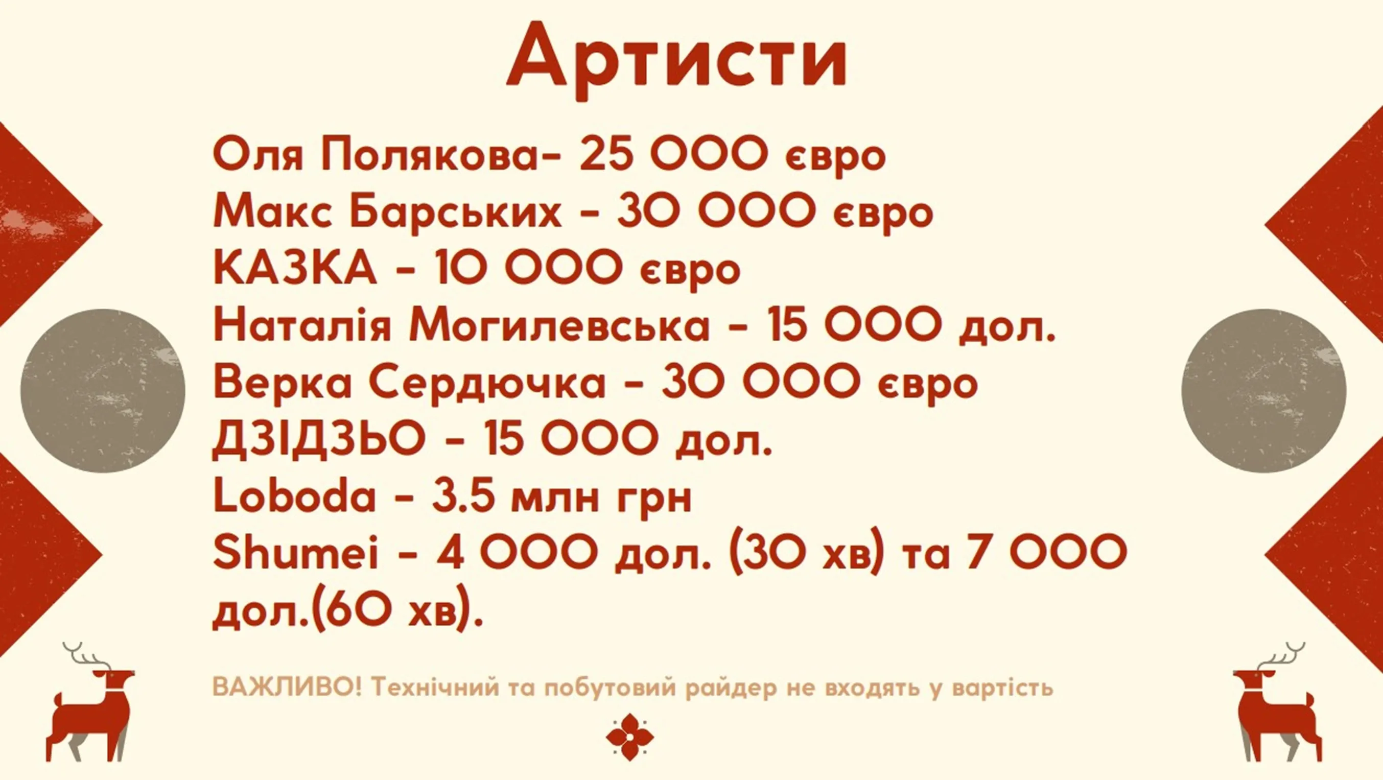 Один з найвищих гонорарів запросила Світлана Лобода – 3,5 мільйони гривень (близько 100 тисяч доларів). Можливо, це тільки спосіб піару і спроба довести затребуваність, адже зазвичай артисти вказують прайс у валюті, до того ж він значно менший, ніж у співачки.