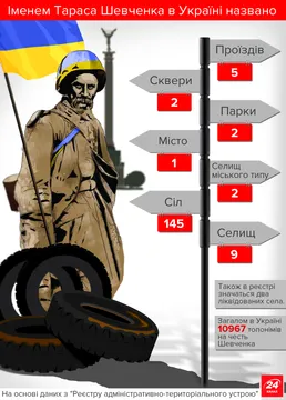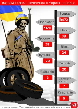 Так, з іменем Шевченка в Україні названо 9472 вулиць, 1178 провулків, 39 площ, 25 проспектів, 24 в'їзди, 20 бульварів, 20 тупиків, 8 майданів, 7 районів у містах, 6 кварталів, 5 проїздів, два сквери та два парки.