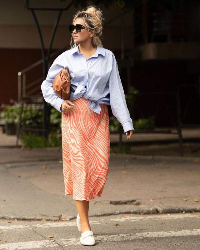 Українська співачка Наталія Могилевська не втомлюється ділитися стильними образами зі своїми шанувальниками. Для нового аутфіту зірка поєднала блакитну сорочку з яскравою спідницею.