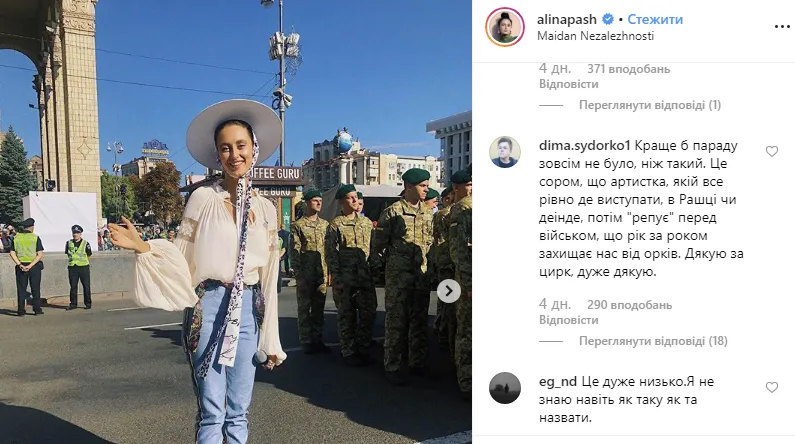 Не оминула увагою артистка й критику щодо її виступу на День Незалежності. Alina Pash зізналась, що сама написала текст, який зазвучав на параді. Виступ був спланований та не є частиною державного гімну.