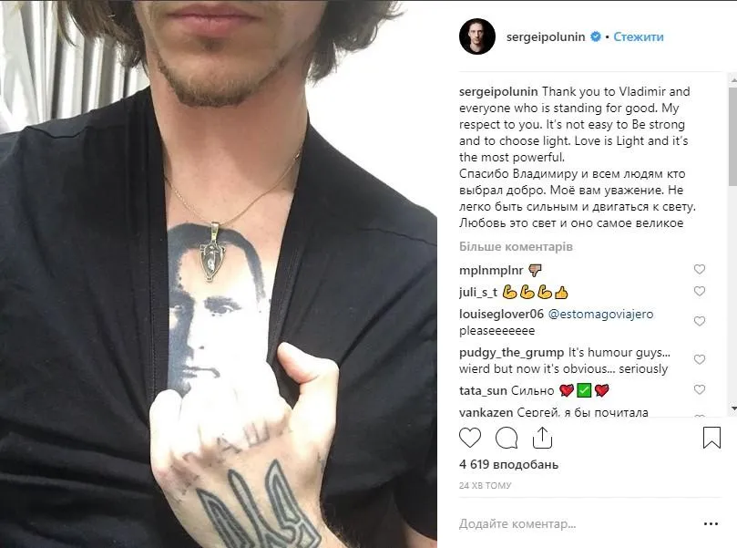 Згодом танцівник до скандального тексту додав фото із зображенням обличчя російського лідера на грудях. Примітно, що при цьому Полунін демонструє і татуювання на руці – воно у нього у вигляді тризубу.
