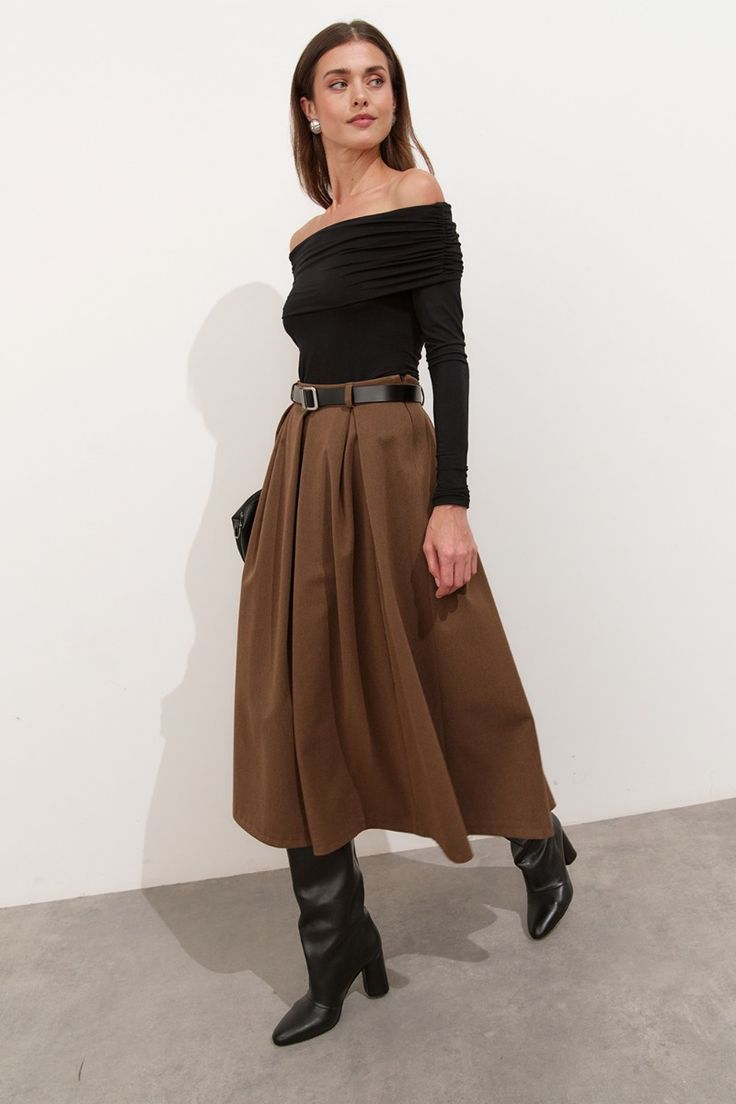 У 2026 році в тренді будуть спідниці з таких матеріалів, як шерсть, твід, оксамит та інші теплі тканини, що добре підходять для зимових образів.