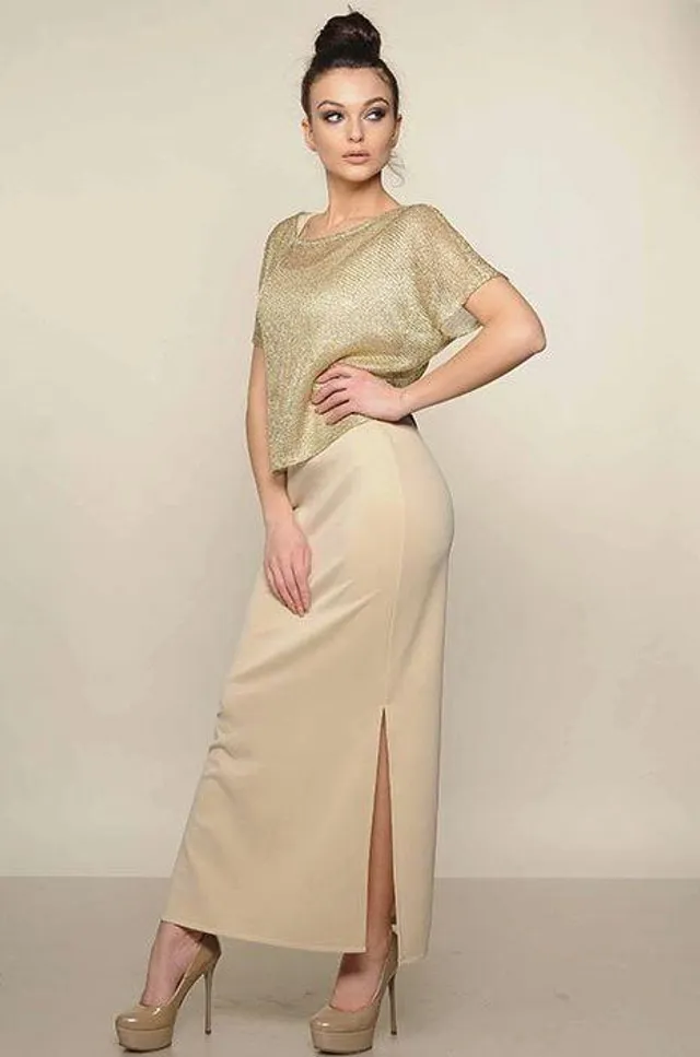 Стильна бежева сукня в підлогу і блискучий топ поверх неї приємно вразить усіх ваших рідних