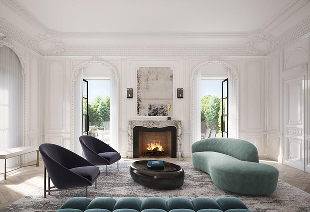 Інтер'єр великого маєтку прикрашають розкішні гвинтові сходи, мармурові каміни, кришталеві люстри та позолочені світильники.