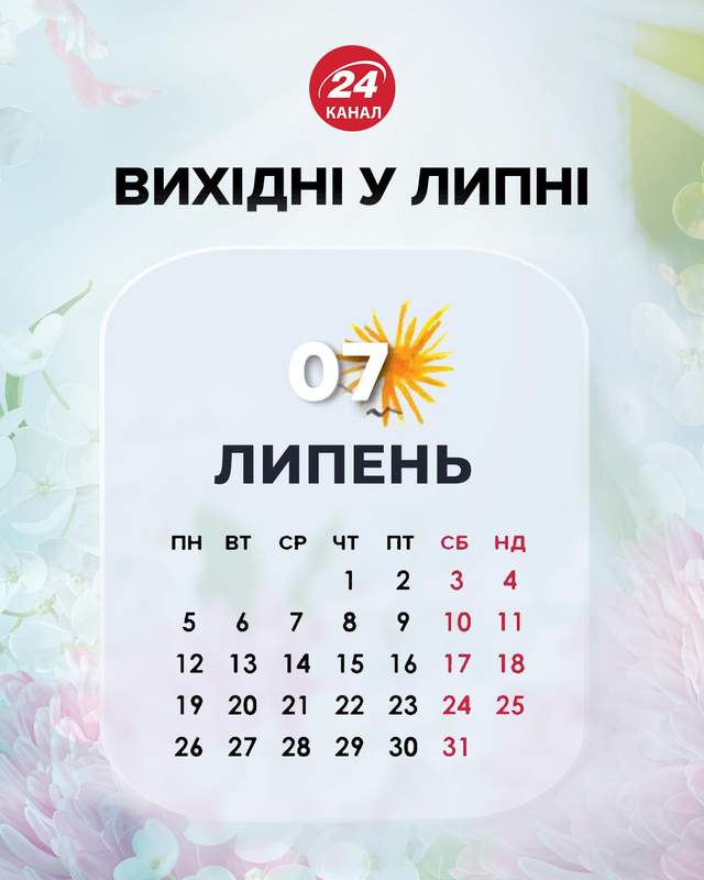 Другий місяць літа тішить теплом й неймовірною атмосферою, про яку ми мріяли ще під час снігів і лютих морозів. Традиційно у липні налічується 31 день. У цьому місяці на українців чекає 22 робочих дні, а також 9 днів вихідних – це суботи і неділі. Хоч липень і багатий на різноманітні свята, державних вихідних у ньому не передбачено.